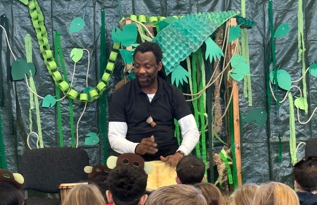 Diese Geschichte sollte uns nun die ganze Woche bis zur großen Aufführung begleiten. Montag starteten wir sofort in der ersten Stunde mit einem gemeinsamen Morgen-Trommel-Gruß mit Leo, der uns die ganze Woche begleitet hat. Danach probten die Kinder alle klassenweise mit ihm in der Sporthalle für ihre jeweiligen Rollen. Sie lernten verschiedene Rhythmen, Tänze und Lieder. Das sorgte die Woche über für viele Ohrwürmer: