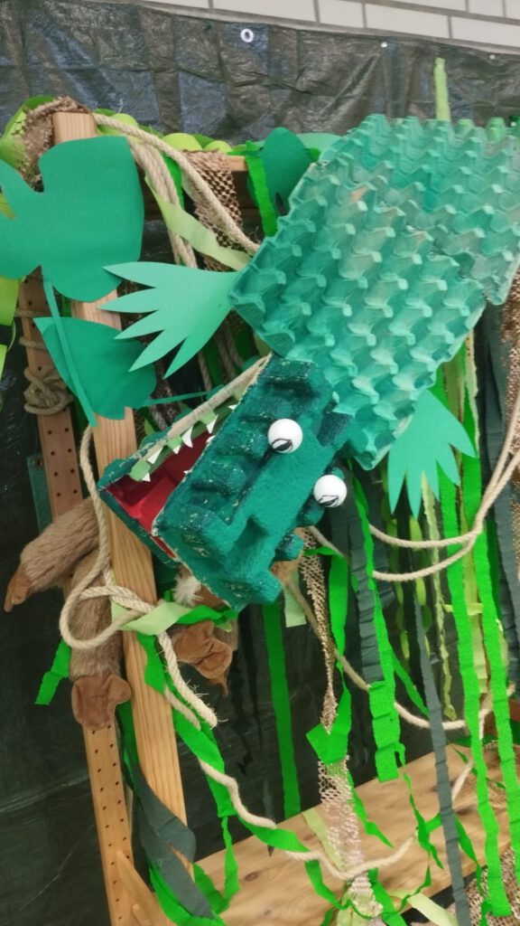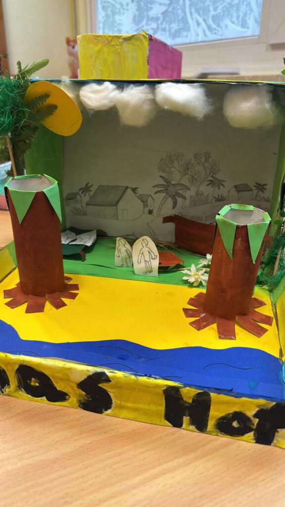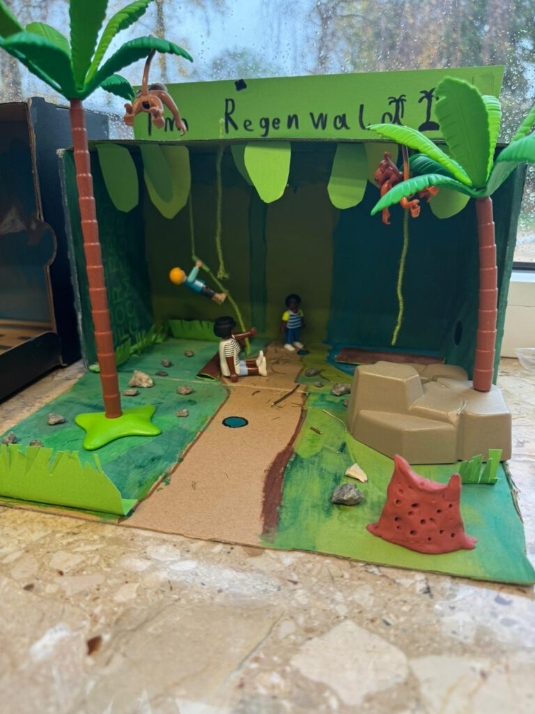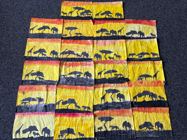 In den Klassen wurden in der probefreien Zeit fleißig Masken gebastelt, Bühnenbilder erstellt, Informationen zu Afrika weitergegeben, gebacken und gelesen. Die vierten Klassen lasen z.B. die Lektüre „Meine Oma lebt in Afrika“ und erstellten dazu eine „Bücherkiste“. In den zweiten Klassen wurde Bananenbrot und Bananenwaffeln gebacken, sich mit der Savanne beschäftigt und dazu ein Bild erstellt.
