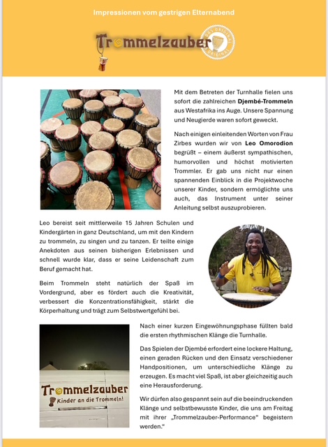 Die Eltern wurden am Montag zu einem Trommelabend eingeladen und durften ein bisschen Trommelzauber schnuppern: