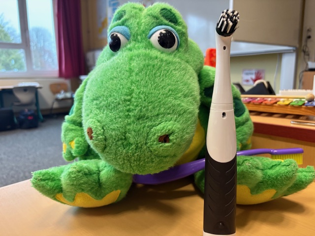Gemeinsam erklärten sie, wie oft und vor allem wie man richtig die Zähne putzt. Die Kinder bekamen alle eine Zahnbürste in die Hand und durften mit Kroko gemeinsam das Zähneputzen üben.